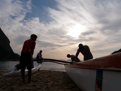 Na minha canoa não tinha muito espaço para muita graça, as meninas sabiam que quando o mar está generoso na ida pode ser que na volta explique o porque. Ester vira e mexe olhava para trás pois a canoa pesava e devia ser a leme fotografando, mas deixei para Carla o risco de ser surpreendida. O mar estava bem ruinzinho na volta, um pouco de vento nordeste entrando e incomodando, uma ondulação jogando meio em diagonal para a praia. Foi mais dura a volta depois que entramos em Copacabana.